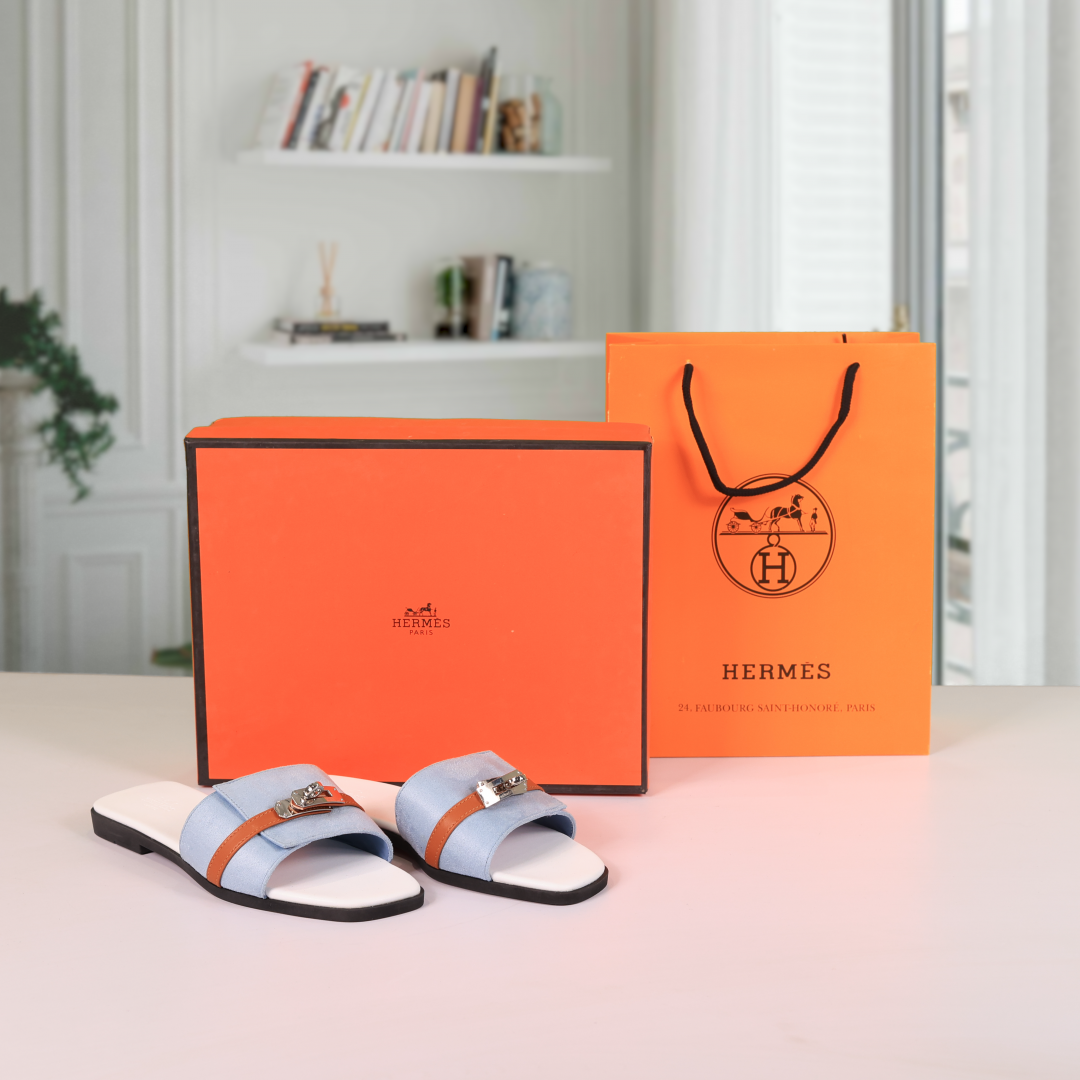 Hermes Paris Birkin Premium Flats With OG Box & Carry Bag (Blue White - 885)