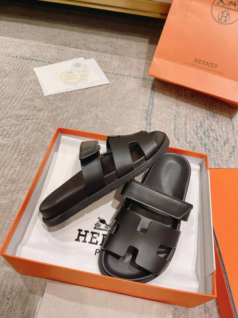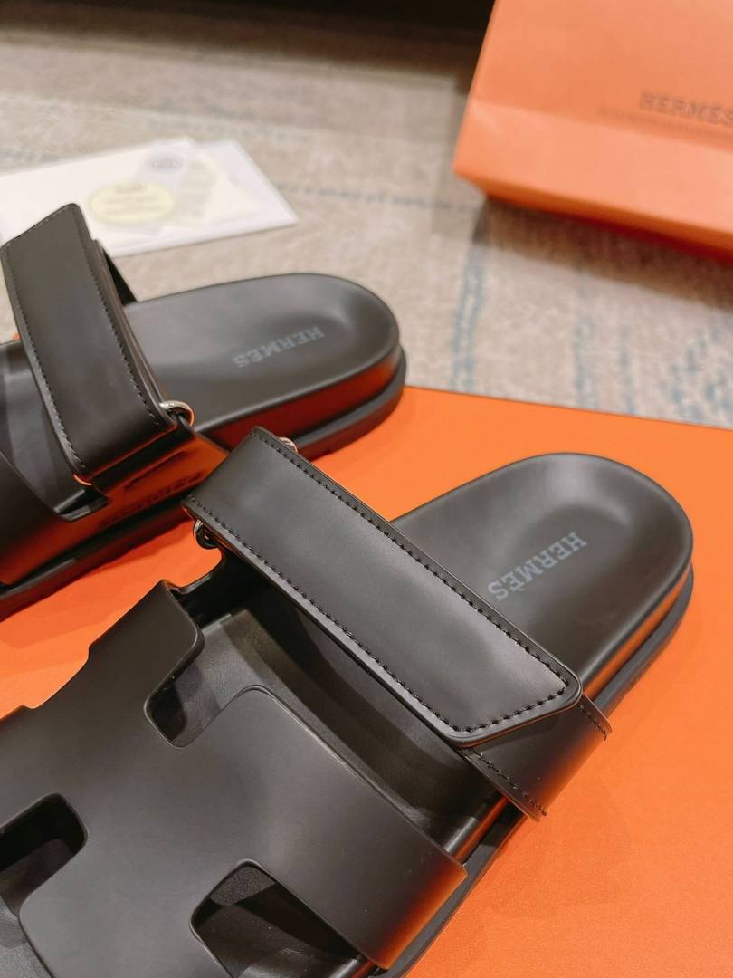 • HERMES Calfskin Mens Chypre Sandals Black